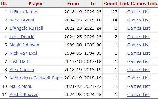 2025-03-23 22:13:26湖人队史30+5+5+5三分场次:詹姆斯27 科比14 东契奇&拉塞尔2