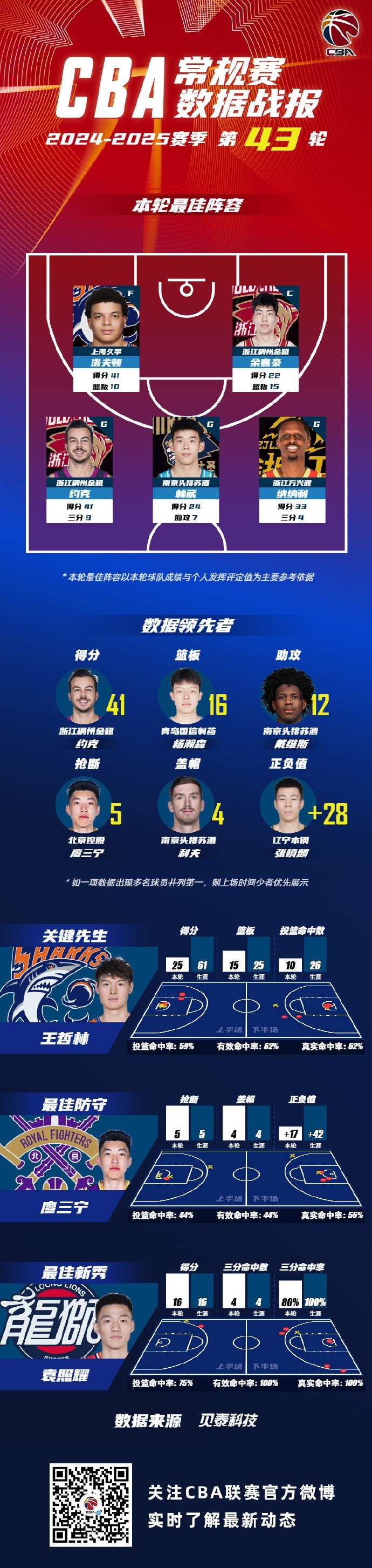 2024-2025赛季CBA联赛常规赛第43轮结束较量,来自上海久事大鲨鱼的洛夫顿,浙江稠州篮球俱乐部余嘉豪和约克,南京同曦篮球俱乐部的林葳和浙江广厦篮球俱乐部的纳纳利入选CBA联赛常规赛第43轮最佳阵容!