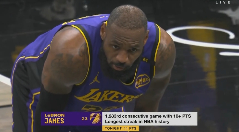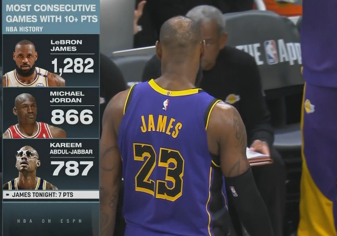 2025-03-27 20:50:28虽迟但到!詹姆斯第四节开局连得8分连续1283场比赛得分上双!