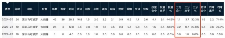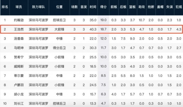 PS:当然如果把区间拉大到整个第三阶段,王浩然也有场均13.3分4篮板3.6助攻1.1抢断1.8失误,命中率48.9%,三分命中率28%罚球命中率65%,可以说是一个很全面扎实的锋线数据了。
