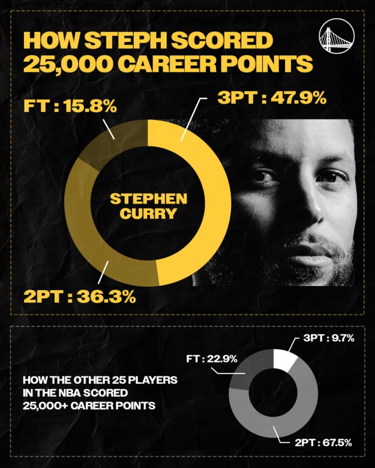 2025-03-10 12:51:14独树一帜!库里25000分中得分方式占比:三分47.9% 罚球仅15.8%