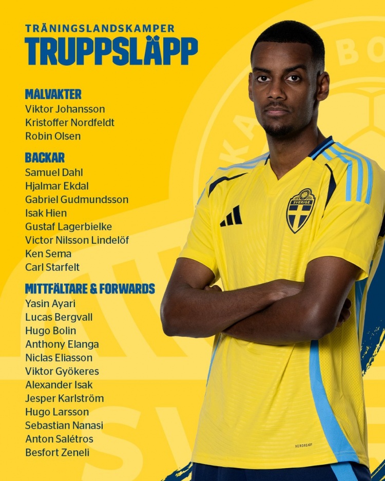 中前场:阿亚里(布莱顿)、贝里瓦尔(热刺)、博林(马尔默)、伊兰加(诺丁汉森林)、埃利亚松(雅典AEK)、约克雷斯(葡萄牙体育)、伊萨克(纽卡)、卡尔斯特罗姆(乌迪内斯)、雨果-拉尔森(法兰克福)、纳纳西(斯特拉斯堡)、萨莱特罗斯(AIK索尔纳)、泽内利(埃尔夫斯堡)