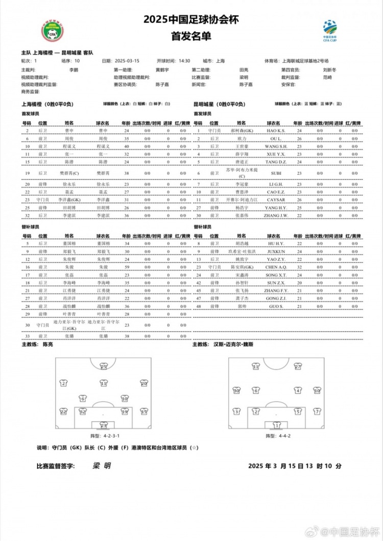 2025-03-15 17:25:37准备出战!59岁朱骏再战足协杯,位列上海橘橙本场替补名单
