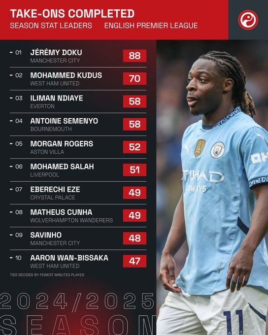 2025-03-18 02:05:07本赛季英超成功过人榜:多库88次独自领跑,萨拉赫、萨维尼奥在列