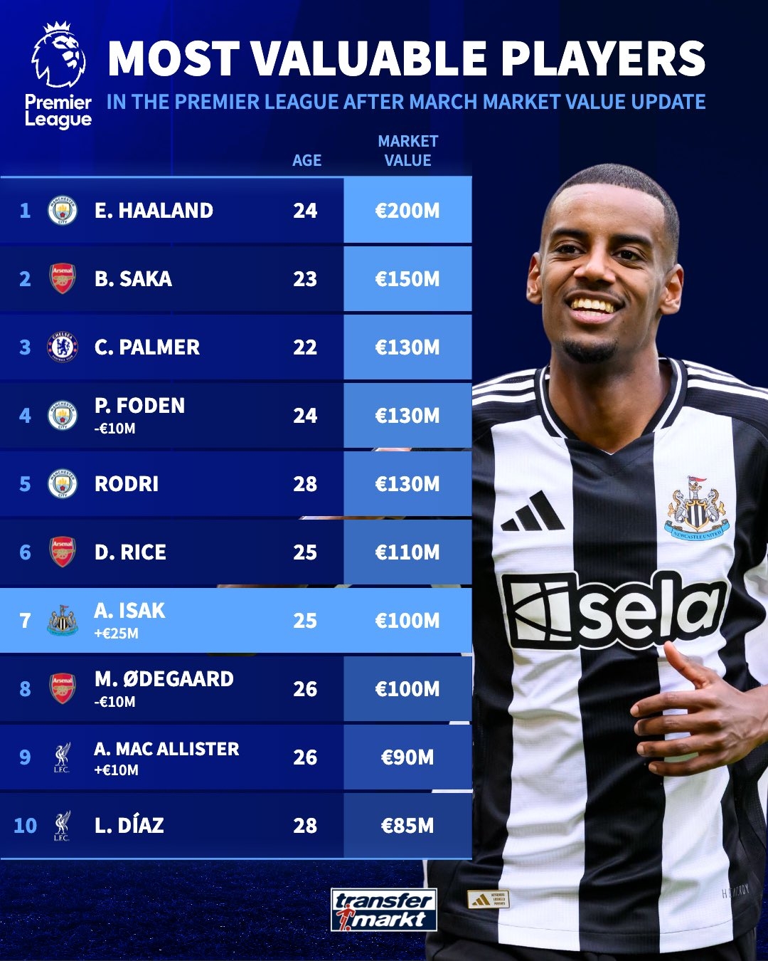 2025-03-18 21:10:47英超身价前30:哈兰德2亿萨卡1亿5不变 伊萨克首破亿恩瓦内里入榜
