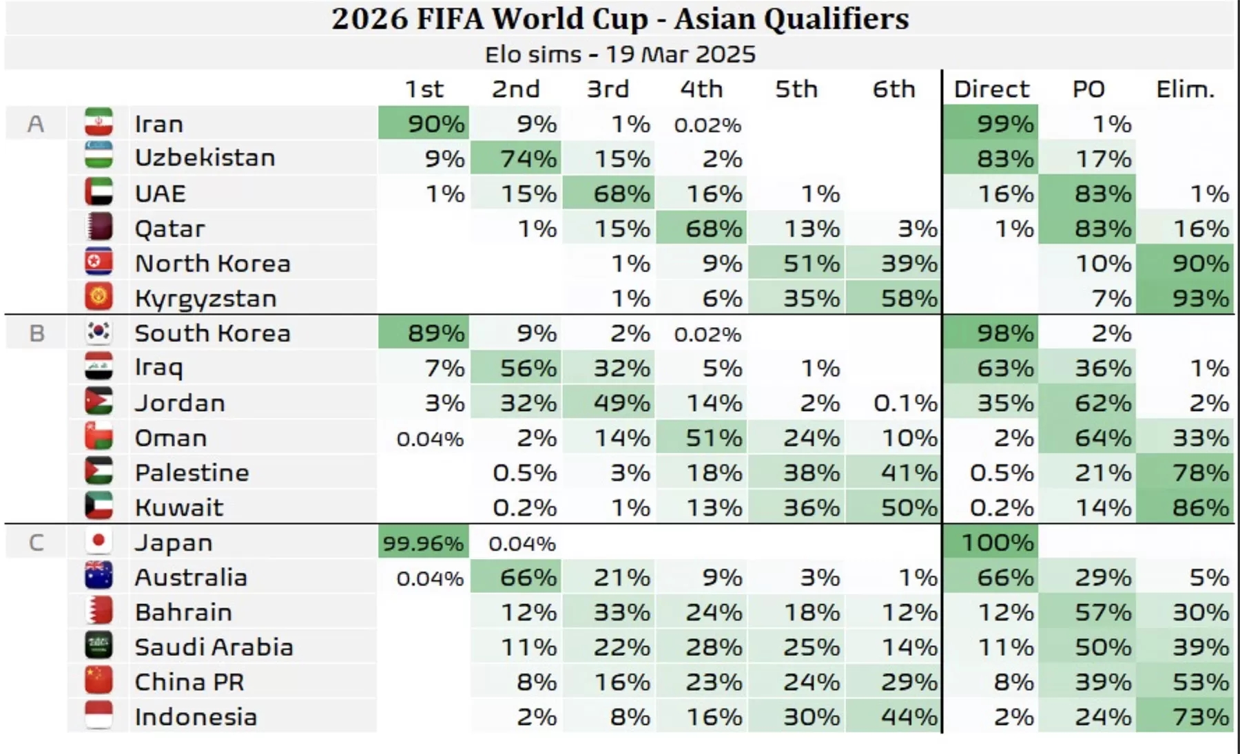 2025-03-20 17:13:3018强赛直通世界杯概率:日韩伊3队稳进 国足仅有8%