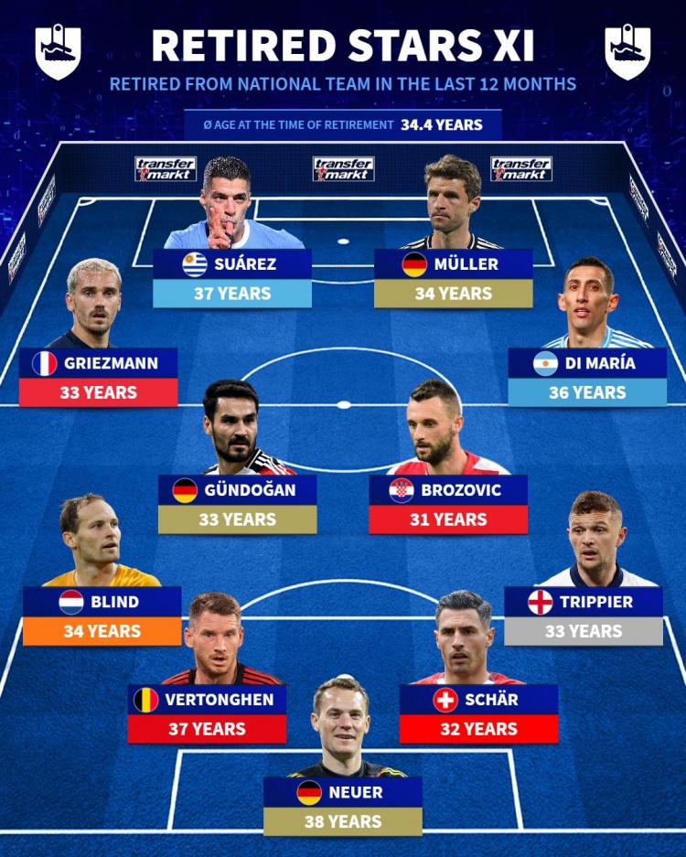 2025-03-23 18:03:19近一年国家队退役球星阵容:苏牙、穆勒、天使、诺伊尔在列