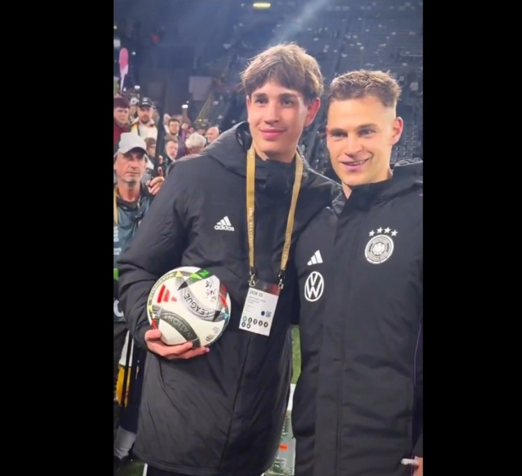 2025-03-24 09:35:40德国球童助力快发角球破门,基米希赛后送上签名足球并合影鼓励
