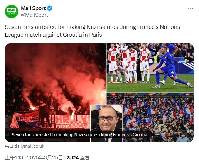 2025-03-25 14:35:08邮报:7名球迷因在法国vs克罗地亚比赛中行纳粹礼,被警方拘留