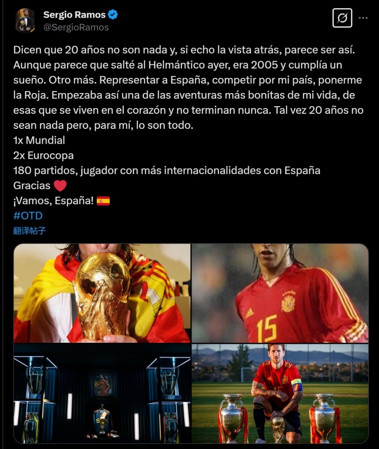 2025-03-27 08:53:41拉莫斯更新社媒,庆祝他代表西班牙国家队首秀20周年
