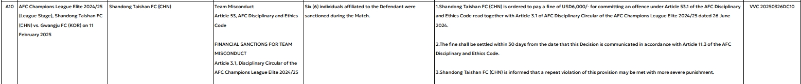 2025-03-28 19:59:15又被罚了!亚足联官方:泰山对阵光州时6人染黄,罚款6000美元