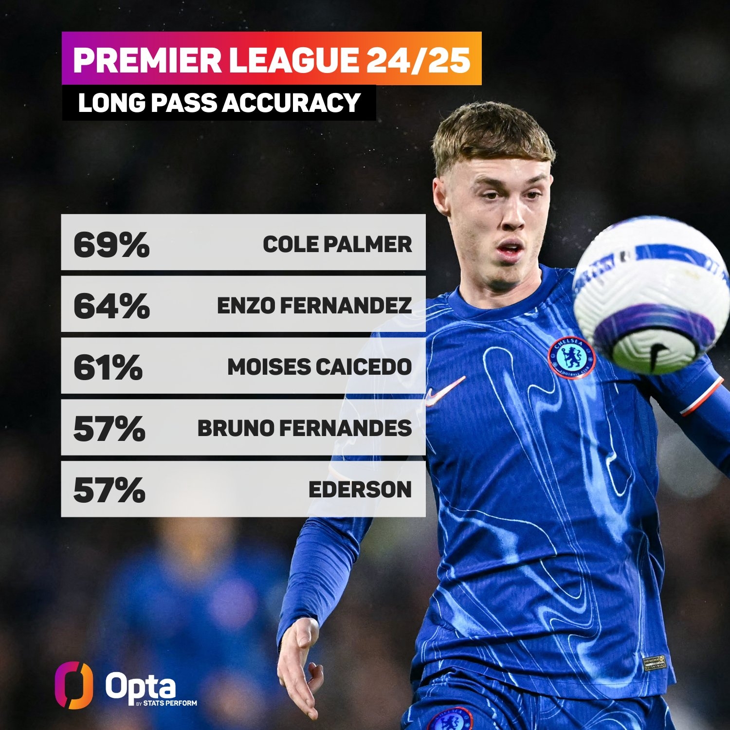 2025-03-01 00:42:11英超长传成功率榜:帕尔默居首,恩佐第二、凯塞多第三