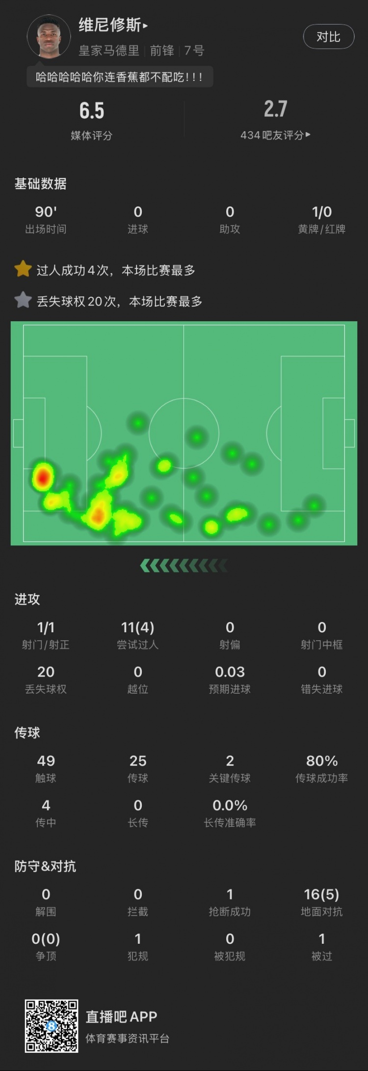 2025-03-02 09:31:31维尼修斯本场:丢失球权20次全场最多,染黄,11次过人成功4次,