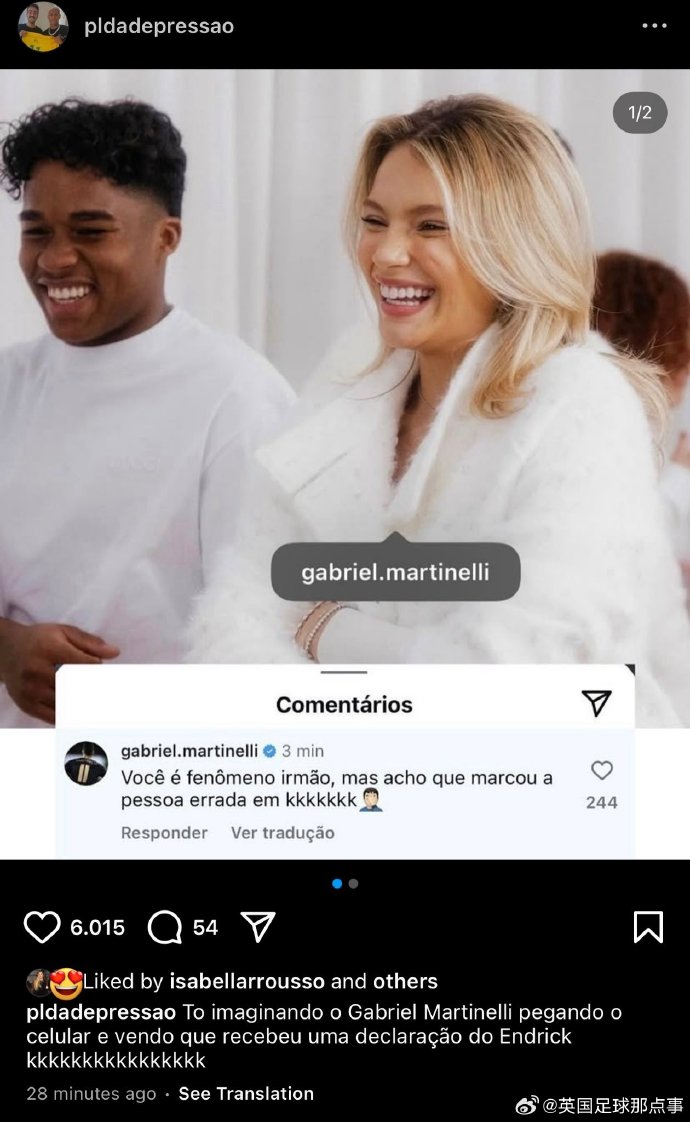 2025-03-09 14:19:47【不小心】恩德里克在社媒晒妻子,却标注成了阿森纳的马丁内利