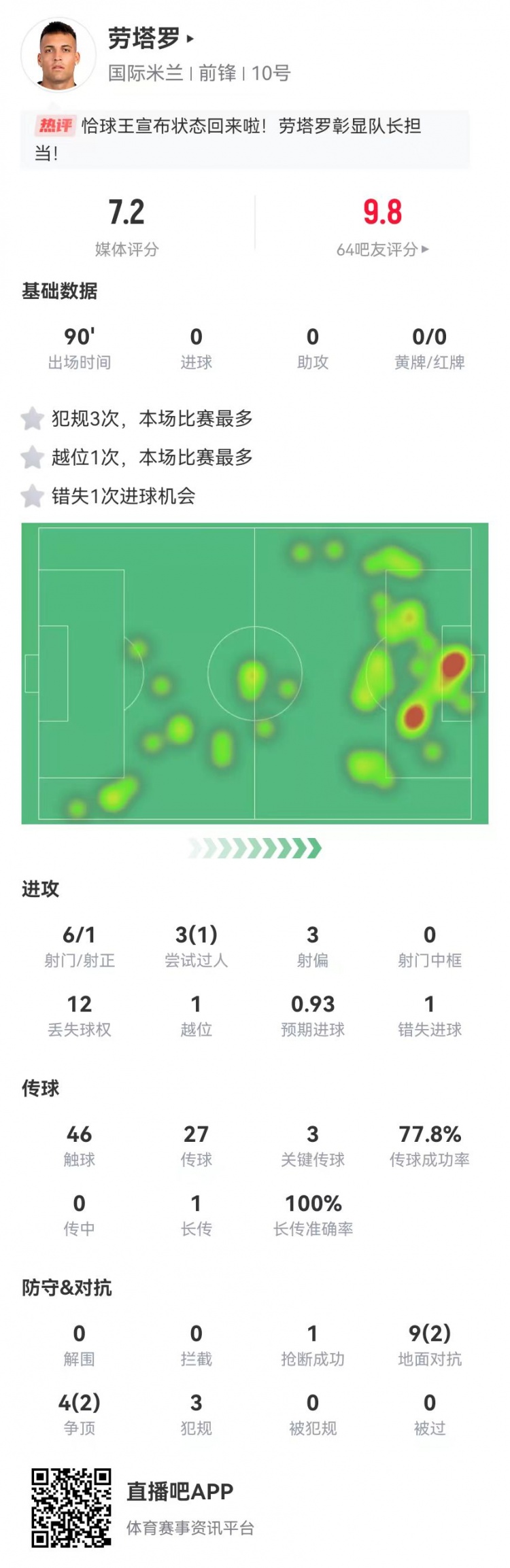 2025-03-09 14:25:27劳塔罗本场数据:6射1正+1失良机 3关键传球+3犯规 13对抗4成功