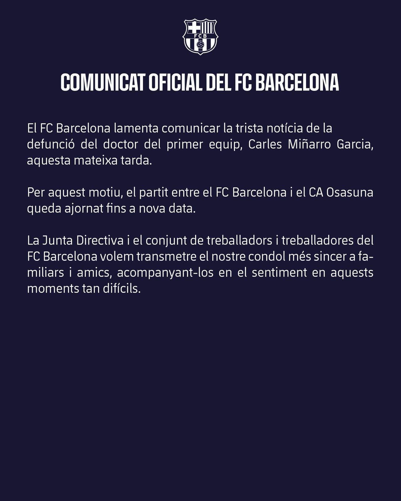 突发!巴萨官方:因一线队队医去世,巴萨vs奥萨苏纳延期进行