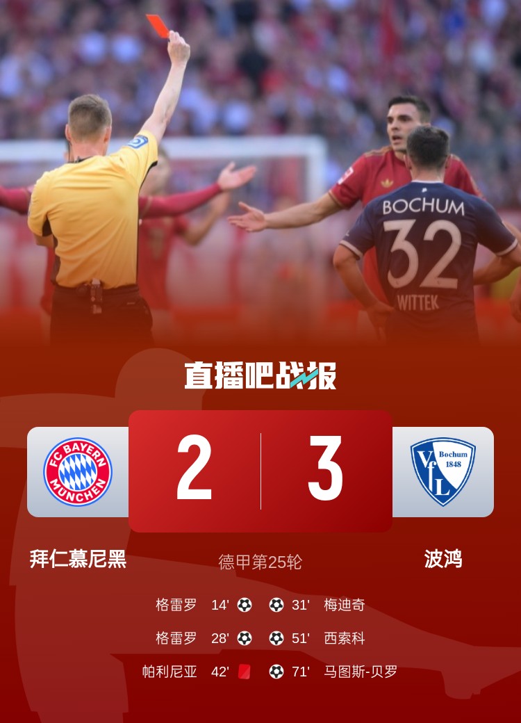 德甲第25轮,拜仁2-3遭波鸿逆转。上半场,格雷罗爆射破门,萨内造点、格纳布里失点,穆勒助攻格雷罗双响,梅迪奇扳回一球,帕利尼亚直红;下半场,西索科头球扳平,贝罗反超比分。