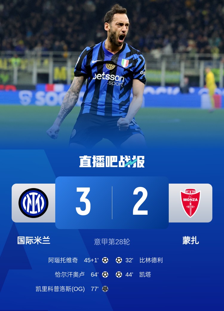 2025-03-09 14:25:16贴地斩扳平比分!官方:恰尔汗奥卢当选国米vs蒙扎全场最佳